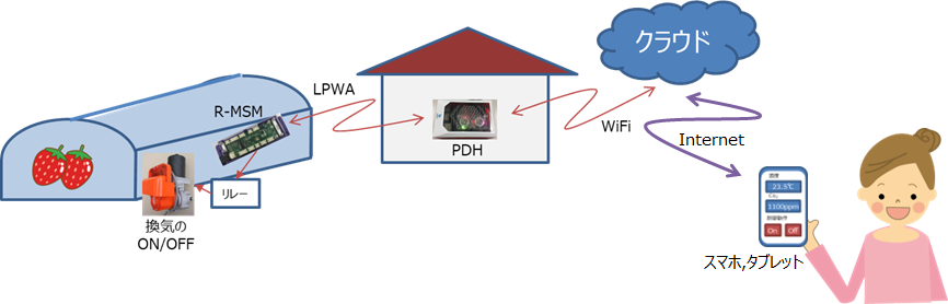 ここでは、外出先でスマートフォンやタブレットなどから、クラウドのダッシュボードをモニターし、ビニールハウス内の気温上昇や下降により、ビニールハウスの換気を行う場面を想定して、クラウドのダッシュボードからビニールハウスのモータを駆動する方法に関して説明します。