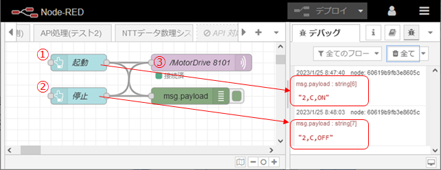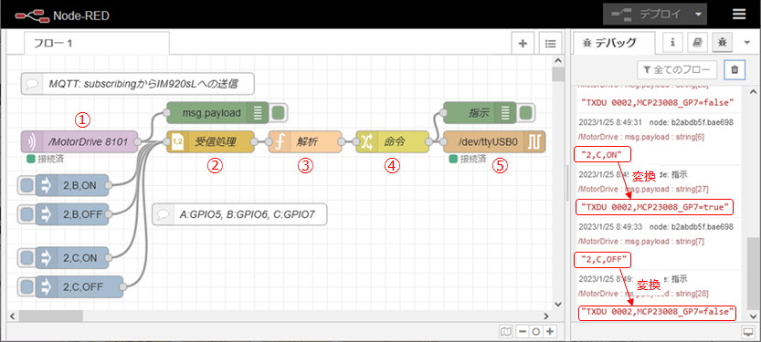 ですので、文字列”2,C,ON”は、{“node”:2,“machine”:“C”,“command”:“ON”}に変換されます。