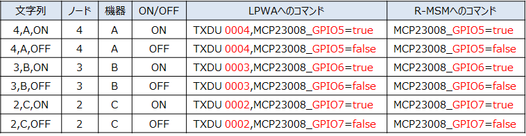 ノード:LPWAのノード番号です。作動させる機器が複数ある場合は、対象の機器についているLPWAのノード番号を指定します。LPWAのコマンドに関しては、“IM920sL間の通信実験”を参照してください。