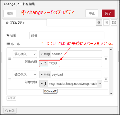 ④changeノードです。JSONata式を使って、LPWAに送るコマンドを作成しています。