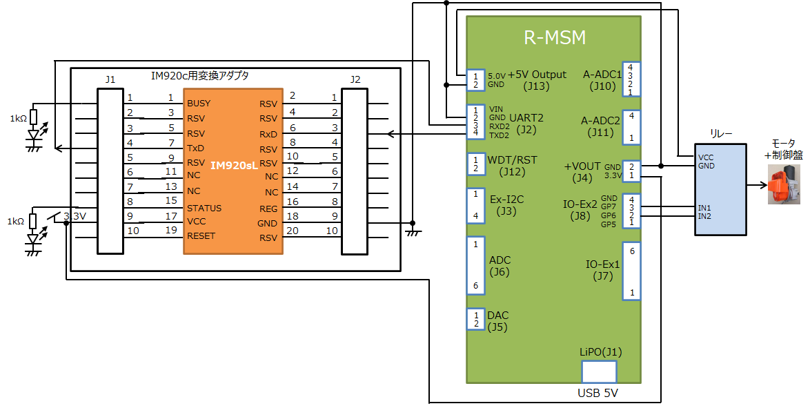 R-MSMは、LPWA(IM920sL)とUARTで接続します。また、モータを駆動するリレーとは、MCP23008のGPIOを使って接続します。以下に回路増を示します。