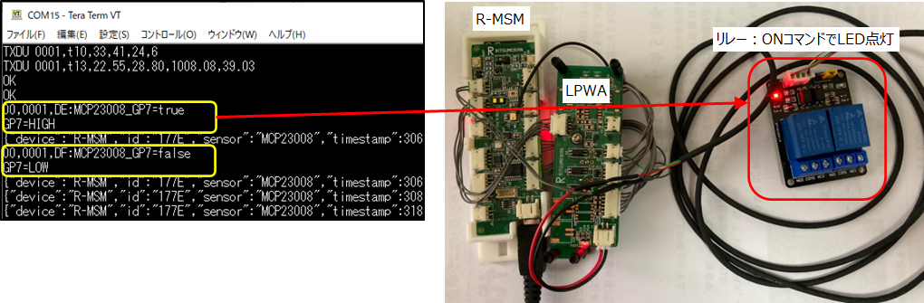 R-MSMをPCに接続し、LPWA(IM920sL)から送られてきたコマンドを受信して、GPIO7をHighもしくはLowにしている状況を次に示します。