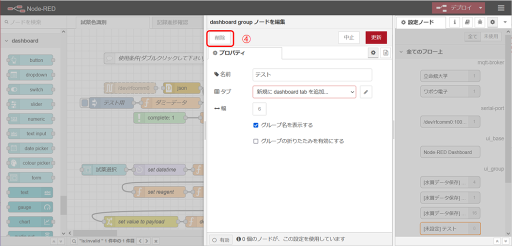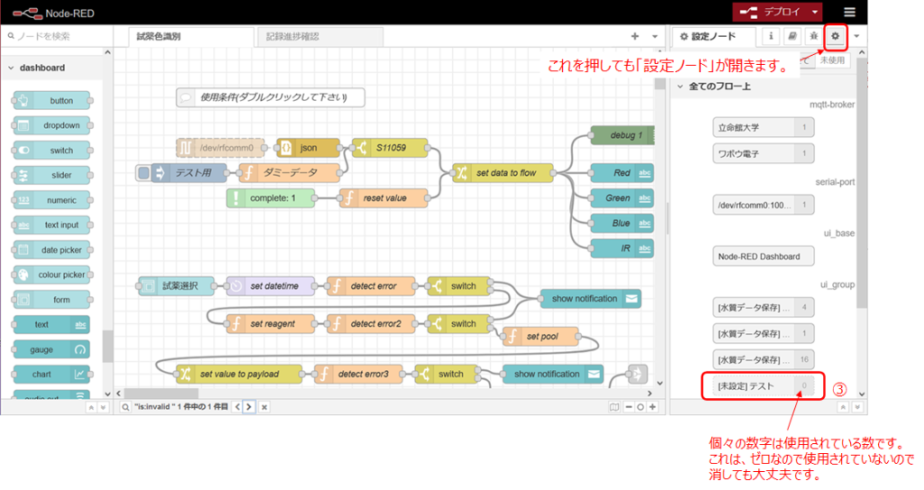 Node-REDのエディタ画面でダッシュボードの設定を行い、「デプロイ」ボタンを押したときに、「以下のノードは、正しくプロパティが設定されていません:」というメッセージが出てしまった場合の対応方法の一つとして、無効なノードを削除する方法を紹介します。
