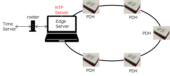 PDHを複数使用するシステムを構築する際には、 PDHはエッジサーバーとともにLANでルーターに接続し、エッジサーバーのみを外部に接続するという構成が、セキュリティ上も都合がよく、よく使われるシステムです。ただし、このシステム構成の場合には、PDHは外部に時刻合わせに行けません。