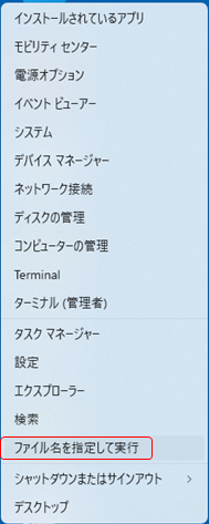 ① スタートメニューを右クリックしてポップアップメニューから「ファイル名を指定して実行」を選びます。