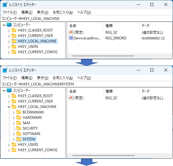 1) レジストリの設定変更:レジストリエディタで3か所修正します。