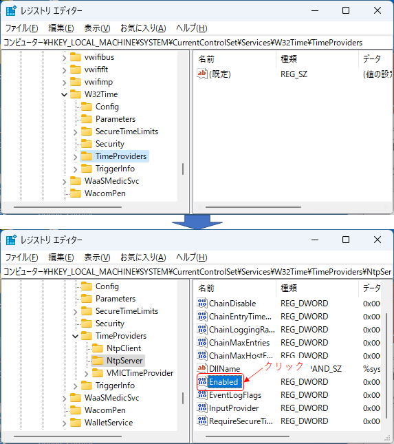 ③ [HKEY_LOCAL_MACHINE]->[SYSTEM]->[CurrentControlSet]->[Services]->[W32Time]->[TimeProviders]->[NtpServer]に移動し、[Enabled]をクリックします。
