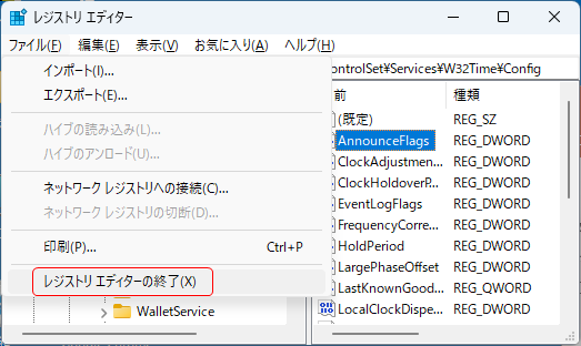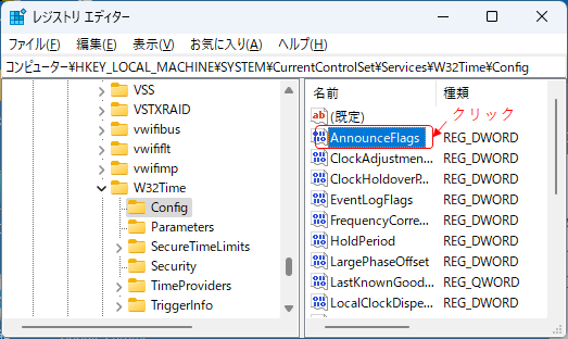 ⑤ 次に、2か所目です。[HKEY_LOCAL_MACHINE]->[SYSTEM]->[CurrentControlSet]->[Services]->[W32Time]->[Config]に移動し、[AnnounceFlags]をクリックします。