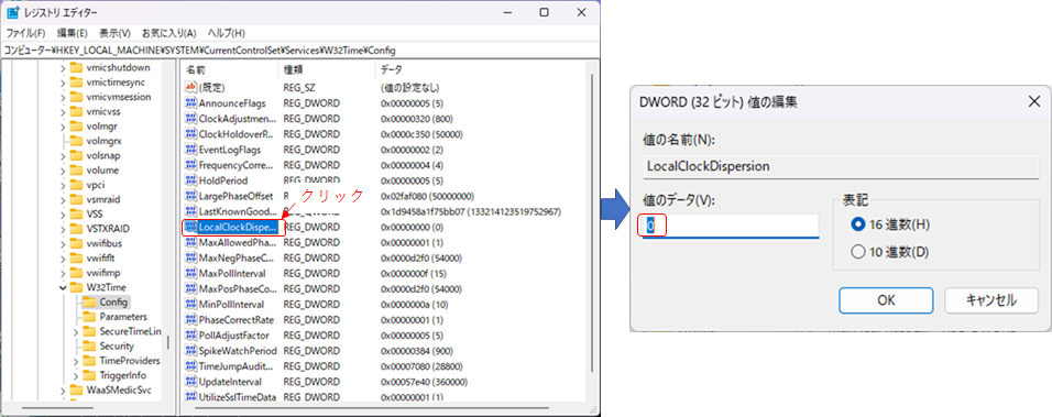 ⑦ 最後の3ヶ所目です。2か所目と同じ[HKEY_LOCAL_MACHINE]->[SYSTEM]->[CurrentControlSet]->[Services]->[W32Time]->[Config]の[LocalClockDispersion]の値を“a”から”0”に変更します。クロックの揺らぎを”0”に設定します。