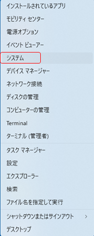 ① スタートメニューを右クリックして、ポップアップメニューから「システム」を選びます。