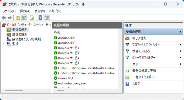 ⑥ ファイアウォールの設定画面が開きます。左側ペインで「受信の規則」をクリックします。 次に右のペインで「新しい規則」をクリックします。