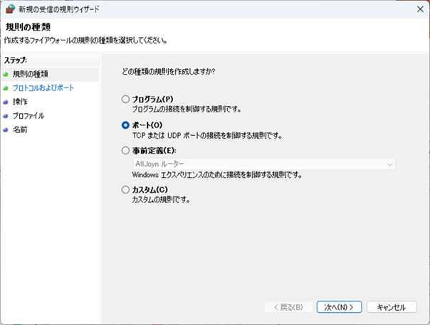 ⑦ 受信の規則ウェイザードが起動します。ポート:123を開けますのでポートを選択し、ポートの規則を作成します。「次へ」を押します。