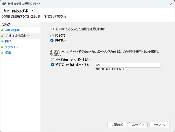 ⑧ 「UDP」を選択します。「特定のローカル ポート」を千t鳴くし、ポート番号 “123”を入力します。「次へ」を押します。