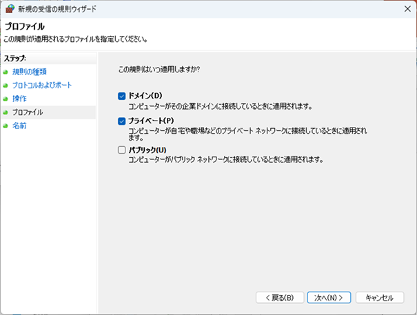 ⑩環境に合わせて選択します。ここでは、「ドメイン」と「プライベート」を選択します。「次へ」を押します。
