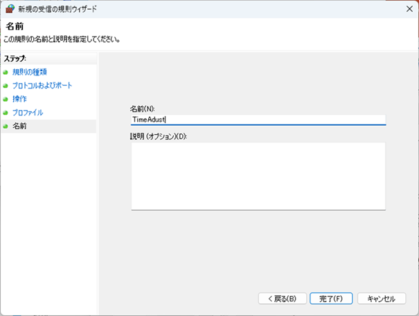 2) ファイアウォールへ規則追加:時刻同期用にポート123を開けます。