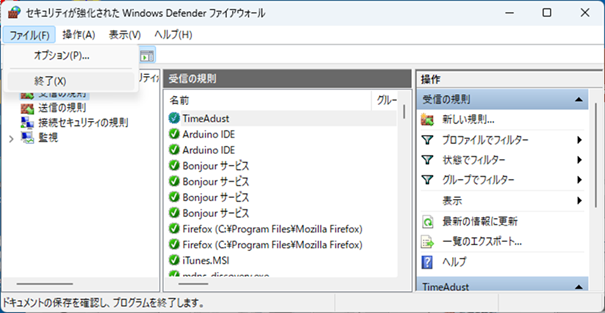 ⑫ 入力した名前で新しい規則ができています。以上で、ファイアウォールの新規規則の作成が完了です。終了します。