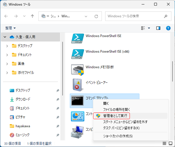 ① スタートメニューから、すべてのアプリを選び、Windowツールを開きます。コマンドプロンプトのアイコンをを右クリックして「管理者として実行」で開きます。