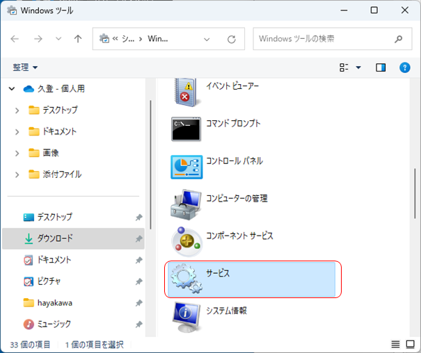 ① スタートメニューから、すべてのアプリを選び、Windowツールを開きます。サービスをダブルクリックします。