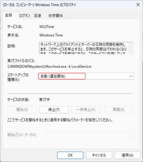 ③ Windows Timeのプロパティが開きますので、「スタートアップの種類」を“自動(遅延開始)”に変えます。「OK」を押します。