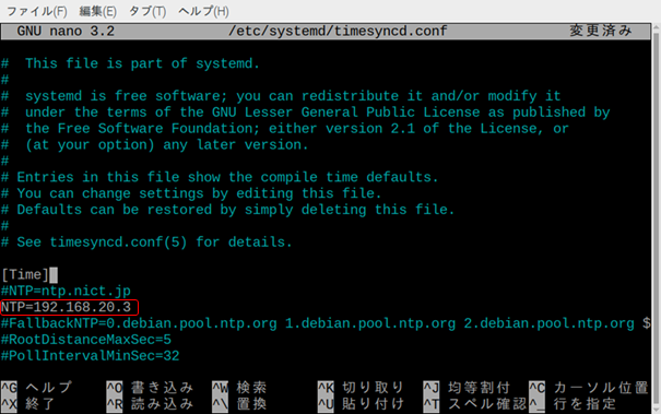 NTPサーバのIPアドレスを設定します。ここでは、192.168.20.03です。