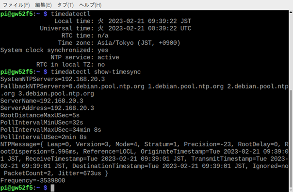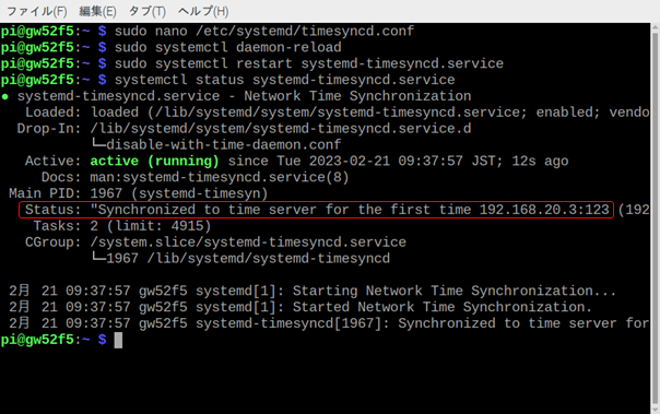 次に、sudo systemctl restart systemd-timesyncd.service で再起動します。