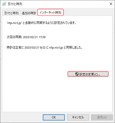 ③ 「インターネット時刻」のタブを選択し、「設定の変更」をクリックします。