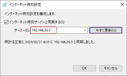 ④ サーバの欄に、ntpサーバのアドレスを入力し、「今すぐ更新」をクリックします。