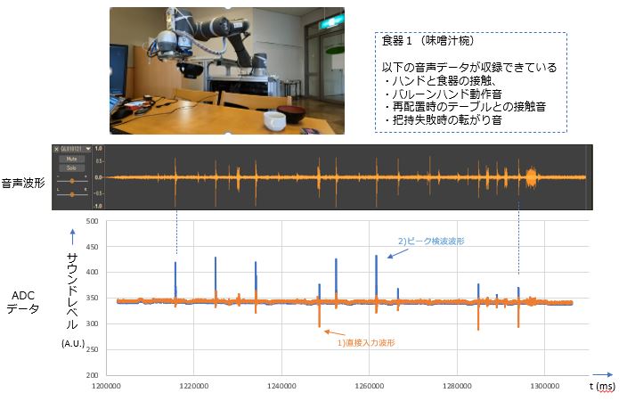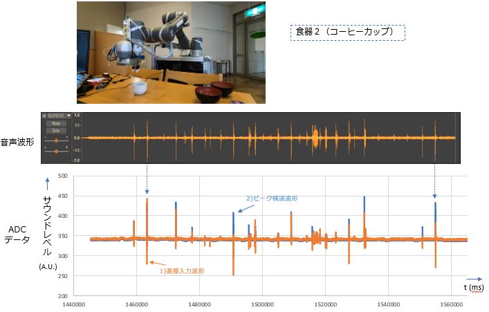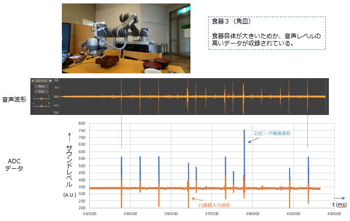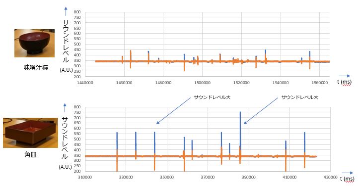 2)サウンドレベルを見ることで、ある程度の食器の種別判定に使える可能性も考えられる