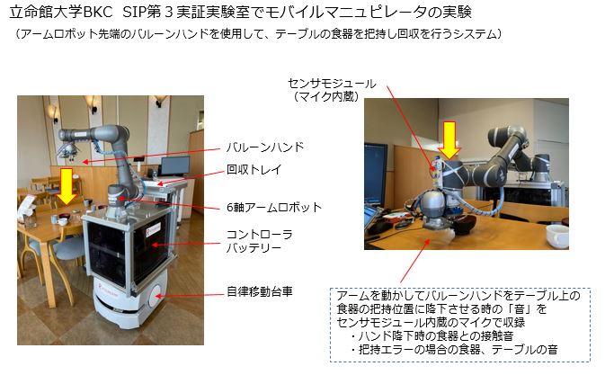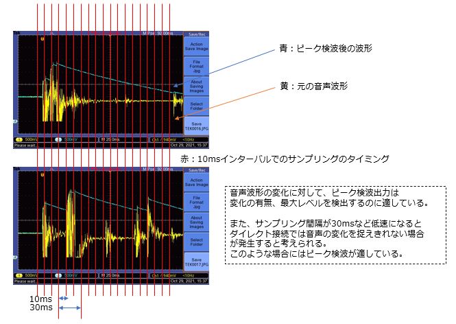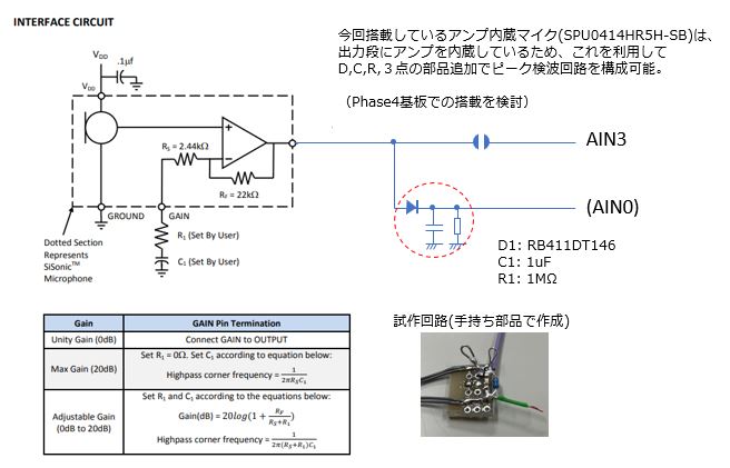センサモジュールのオンボードマイクにはピーク検波回路を接続できる構成となっている。このマイクとピーク検波回路を用いてモバイルマニュピレータ―の作業中の動作音を検出し、食器の種別の判定や異常検出などに利用できないかを検討しました。
