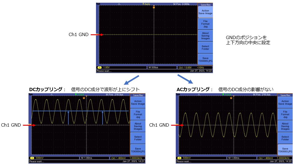 信号の直流成分の影響を受けない状態で交流信号を見る時にACカップリングを使用することがあります。