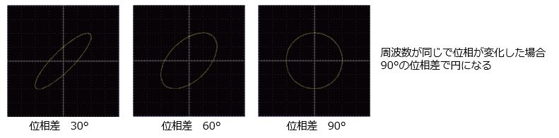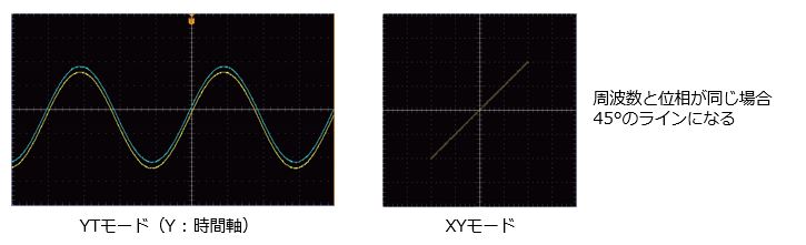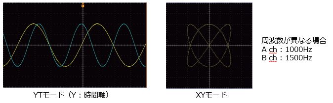 これまで説明してきた使い方は横軸(Y軸)を時間で走査する標準的な使い方ですが、横軸を入力端子に加えられた信号で変化させてもう一方の入力端子の信号で縦軸(X軸)を変化させることで2chの信号がX-Y軸でどのように変化しているかを観測することができるモードがあります。