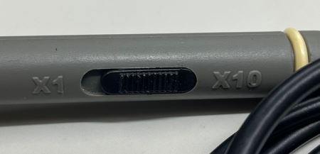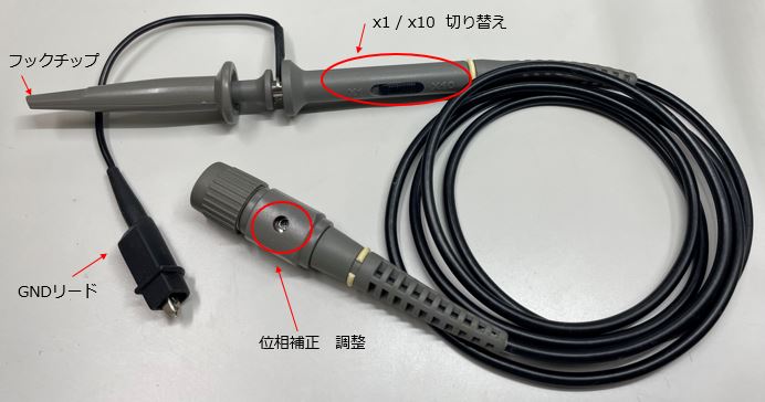 電圧レンジ設定はプローブのアッテネータ設定で1/10になる場合と、自動でアッテネータ設定を検出して1:1で設定できる場合があります。使用するオシロスコープの仕様を見て確認してください。