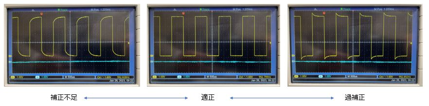 2)オシロスコープとプローブを組み合わせた状態で位相補正を行う必要があります。位相補正は、周波数に対して利得が一定になるようにする調整で、プローブの根元にある可変コンデンサの容量を調整する事で行います。下記のキャリブレーション信号を使用して位相補正の調整を行います。