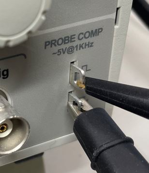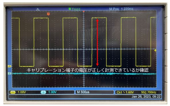 オシロスコープにはたいていキャリブレーション信号出力端子が設けられています。この信号を使用して、入力端子で計測した電圧が正しく表示されているか、またプローブの位相補正が正しく行われているかを確認します。