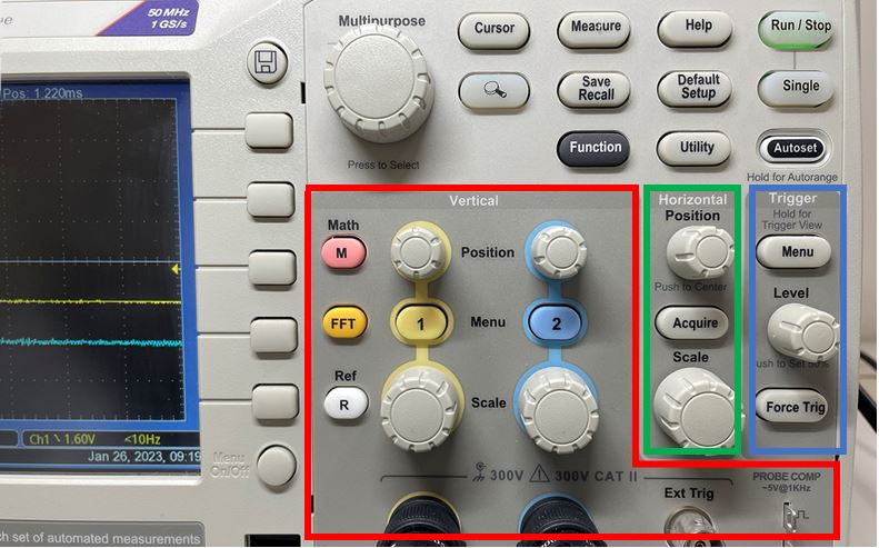 赤:縦軸(電圧)の設定、 緑:横軸(時間軸)の設定、 青:表示タイミング(トリガ)の設定