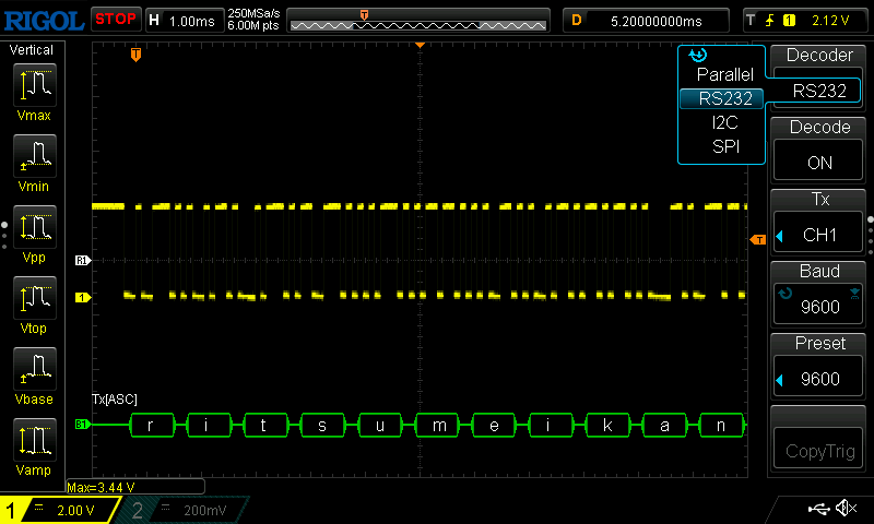 オシロスコープの一部のモデルでは、計測しているインターフェースを流れているデータの内容をデコードして表示する機能を持つものもあります。下記の例ではRS232Cインターフェースの波形と、そのデータを表示しています。