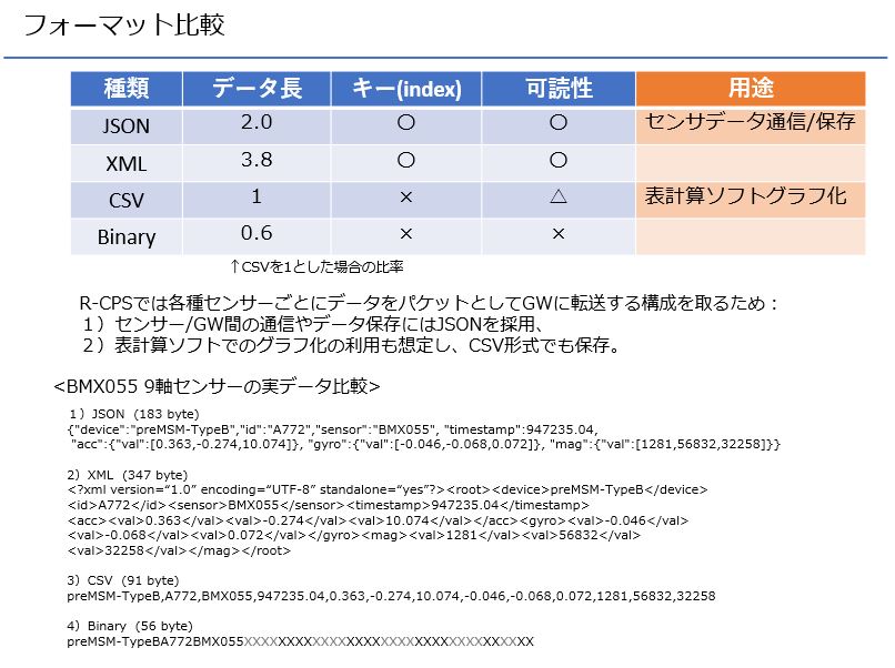 冒頭で述べた通りR-CPSではセンサデータの通信や保存でJSONフォーマットを使用していますが、これは他のフォーマットと比較して可読性が良いフォーマットでありながら軽量であること、R-CPSの処理の中心であるNode-REDと相性が良いことによります。