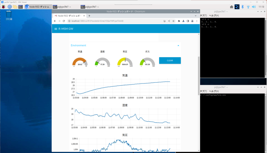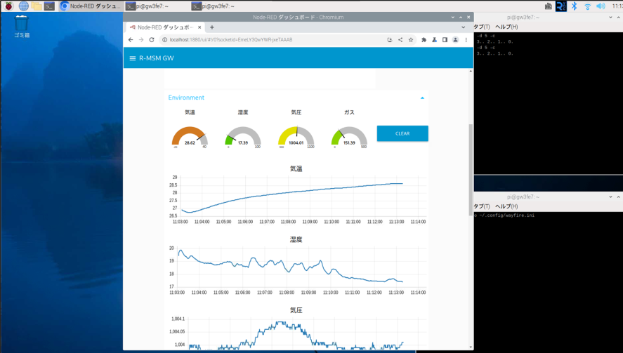 そこで、Raspberry Pi 5をPDH化する検討を行い、次に示すように、R-MSMからBluetoothで環境センサのデータを受信して、Node-REDのダッシュボードで表示することが出来ました。