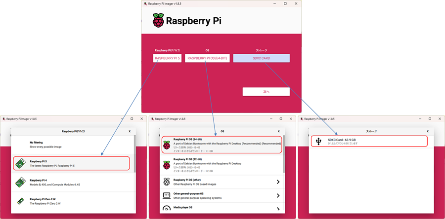 2) Raspberry Pi Imagerを起動したら、デバイス、OS、ストレージを設定します。