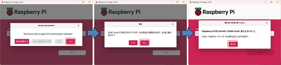 6) 書込みと検証が終わったら、SDカードを抜いて、「続ける」を押します。右上の「×」を押して閉じます。