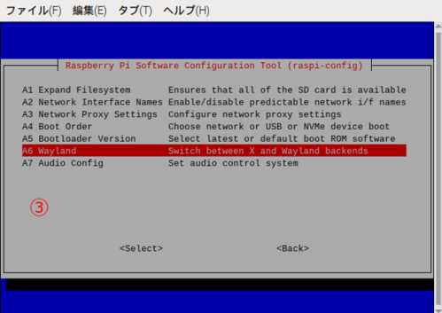 ③ 次に、“A6. Wayland”を選び、リターンを押します。
