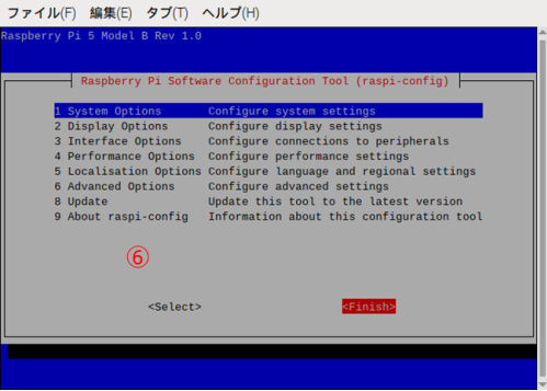 ⑥ 最初の画面に戻りますので、タブ キーを押して、<finish>を選び、リターンを押します。