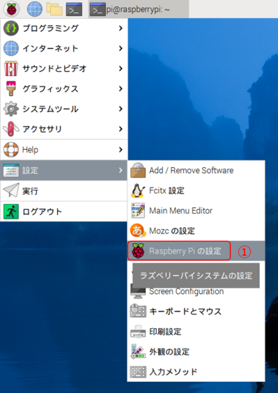 ① メニューで[設定]⇒[Rasberry Piの設定]を選択する。