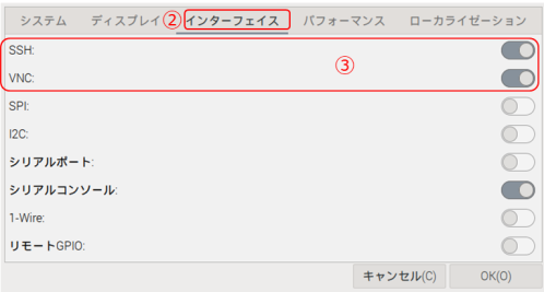 インターフェースの設定を変更し、SSHとVNCが使えるようにします。