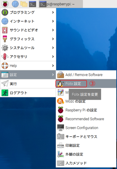 ③ 再起動したら、[設定]⇒[Fcitxの設定]を選択します。