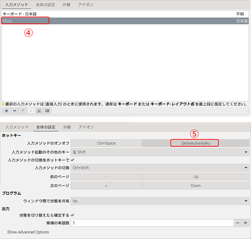 ⑤ 「全体の設定」を選んで、“zenkakuhankaku” を押します。