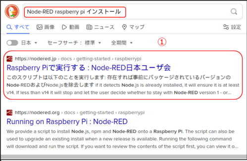 ① ブラウザを起動し、”Node-RED rapberry pi インストール“で検索します。”Raspberry Piで実行する“のページを選びます。