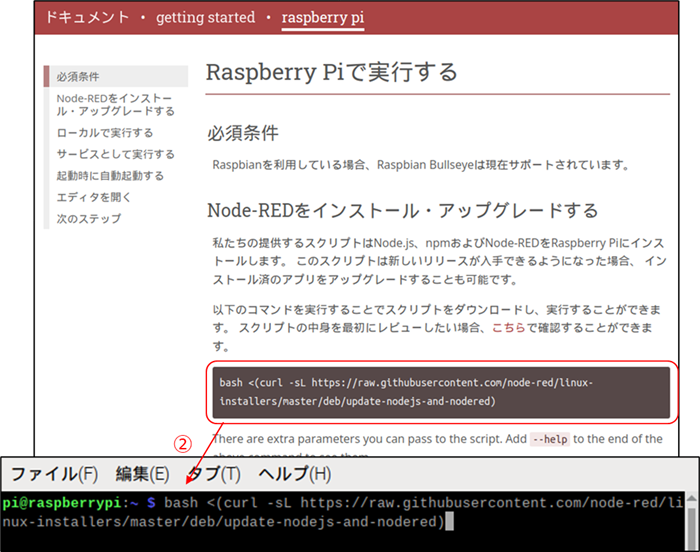 ② Node-REDのホームページにあるスクリプトをコピーして、実行します。