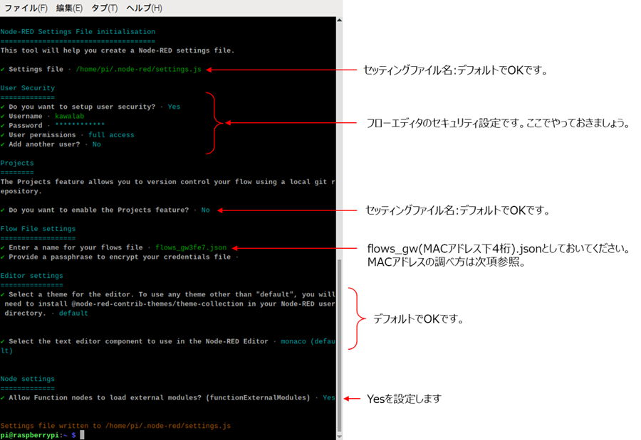 ⑤ インストールが終わると、設定ファイル settings.jsの設定が始まります。内容は、あとからsettings.jsを編集して変えられます。