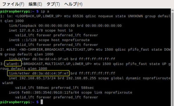 で出てきたメッセージのwlan0のlink/etherの部分です。